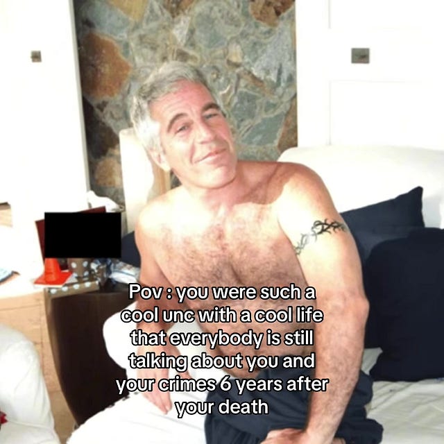 Jeffrey Epstein è ormai diventato “the cool guy” della vulgata internettiana, che ha impiegato pochissimo tempo a passare dall’indignazione alla memificazione. Un processo discutibile, ma in larga parte inevitabile: internet funziona così. È uno spazio ambiguo, sospeso tra scandalo e intrattenimento, dove il black humor si applica anche a temi che richiederebbero tutt’altra serietà.