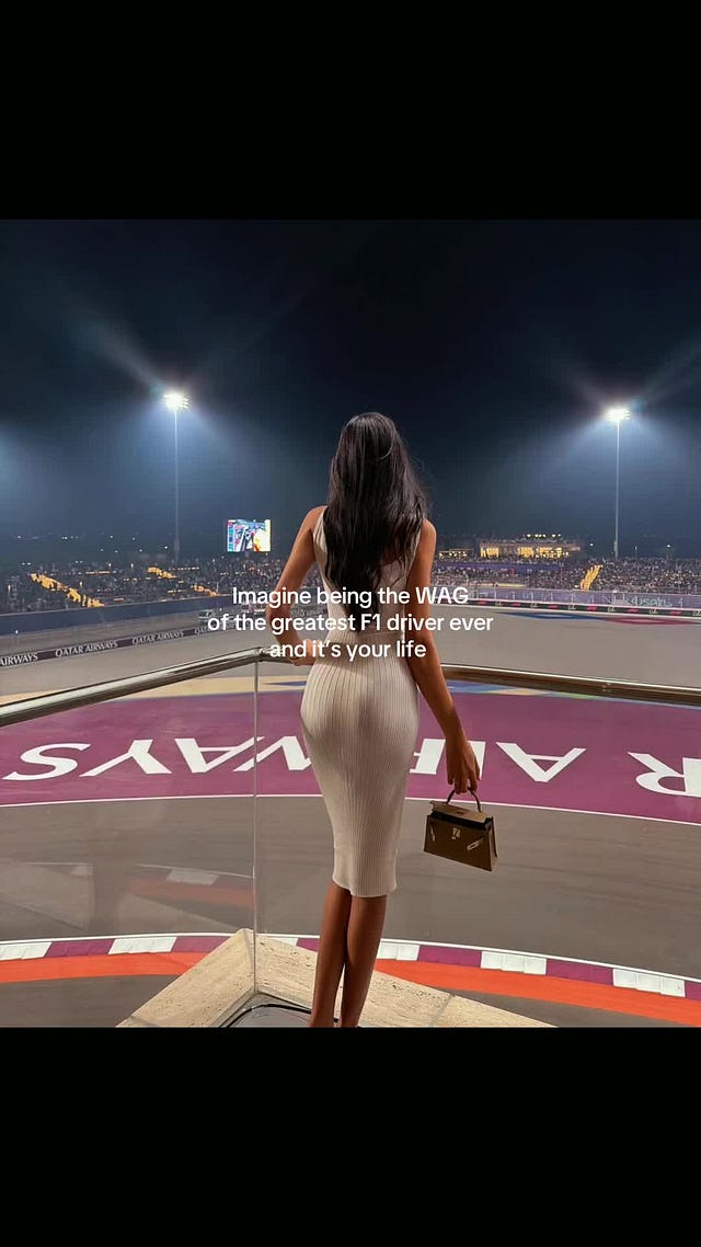 Le WAG assolvono a due compiti: portano nuovi filoni narrativi e il pubblico femminile si identifica con loro. Si tratta di una sorta di “parasocialità by proxy”: la fan non sviluppa il legame unilaterale direttamente con la celebrità, ma attraverso un intermediario (la wag). Dunque, i fandom sostengono le loro compagne, si identificano fortemente con loro, vorrebbero essere loro. Si può immaginare questa raccolta di storie di WAG come una specie di “Favole della buonanotte per bambine ribelli” ma al posto di Margherita Hack e Rita Levi Montalcini, ci sono Alexandra Saint Mleux, Kelly Piquet, Carmen Montero Mundt, Margarida “Magui” Corceiro. I tifosi di vecchia data si lamentano sui social del fatto che il loro sport preferito è stato “invaso dalla WAG Culture”. Le wag sono figure sempre iconico-decorative ma ormai non sono più costrette a reggere né ombrelli, né cartelloni, solo borse costose tenendo al guinzaglio cani di piccola taglia (amatissimi dai fandom). Sfilano sul paddock, presenziano alle gare, hanno profili Instagram e TikTok patinati dove esibiscono i fit check d’alta moda, illustrano la loro skin care, mostrano vacanze extra-lusso. Matrimonio entro i 25 anni, figli entro i 30. Oggi, la Formula 1 sembra concettualmente più vicina a un reality show di casalinghe mormoni, con una gara di macchina sullo sfondo. A posteriori, la scelta dell’aggettivo “puritano” da parte di Bernie Ecclestone sembra meno metaforica e ironica di come suonasse allora.