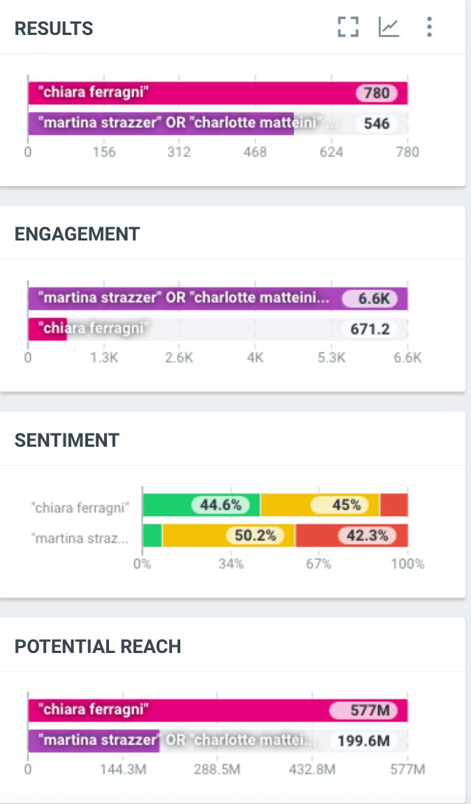 La prima cosa da chiarire è che la shitstorm che ha coinvolto Martina Strazzer e la sua azienda di bijoux Amabile, se paragonata al PandoroGate, è un temporale estivo rinfrescante della durata di mezz’ora, mentre il secondo è l’equivalente di un uragano atlantico che si abbatte sulle coste di Florida e Caraibi. Non è solo una metafora: l’intensità di una shitstorm si può misurare dalla durata, da quante piattaforme sono coinvolte, se passa da “social” a “mediale”, dal numero e dalla fama dei personaggi coinvolti; ma soprattutto dal numero di volte in cui la stessa shitstorm viene citata online, all’interno di singoli contenuti che, a loro volta, generano engagement (like, commenti e condivisioni). Se i contenuti con le citazioni sono pochi ma raccolgono molto engagement, si parla più di flame, che può salire al grado di piccola shitstorm se riesce a conquistare anche qualche titolo di giornale. Ora, utilizzando uno strumento di web listening come per esempio Talkwalker, che non fa altro che contare quanti contenuti citano una determinata parola, possiamo constatare facilmente che, nel periodo compreso tra il 31 agosto e il 6 settembre, la parola chiave “Chiara Ferragni” da sola ha generato lo stesso numero di citazioni della query (stringa di parole chiave) che mette insieme Martina Strazzer, Charlotte Matteini e Selvaggia Lucarelli, cioè le protagoniste della shitstorm del cosiddetto “caso Amabile”: 780 citazioni per Chiara Ferragni, 546 per le altre. Queste ultime citazioni hanno però generato un alto livello di engagement, sebbene complessivamente inferiore a quello di Chiara Ferragni. Un altro dato interessante riguarda il sentiment: le citazioni di Chiara Ferragni presentano oltre il 44,6 per cento di sentiment positivo (tipico dei periodi “normali”), mentre nel secondo caso prevale un 42,3 per cento di sentiment negativo e polarizzato (tipico dei dissing, dei flame e delle shitstorm). Ciò conferma che per quanto riguarda il caso Amabile siamo di fronte più a un grande flame o a una piccola shitstorm, che a un casus di larga portata (e che Chiara Ferragni è in quieta ripresa, mentre nel percepito è ancora totalmente a terra e mai più si riprenderà). In effetti, i giornali hanno dato alla vicenda un minimo di notiziabilità attraverso l’associazione con il PandoroGate e, appunto, con Chiara Ferragni.