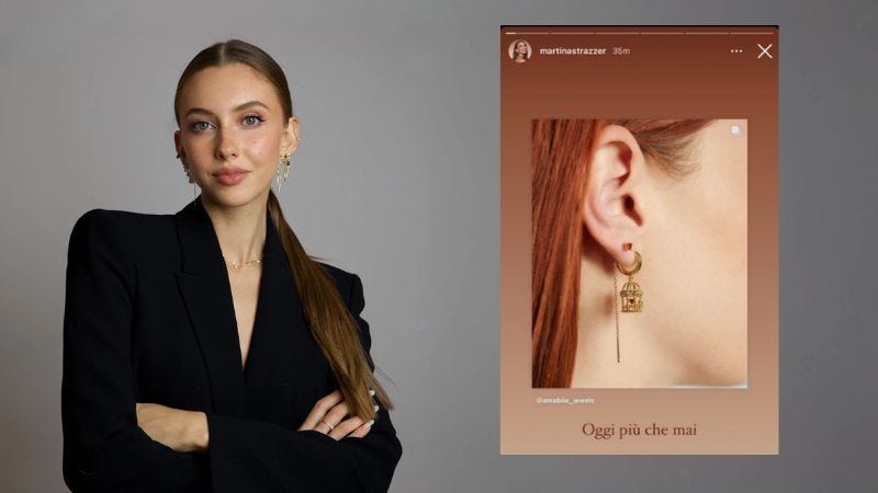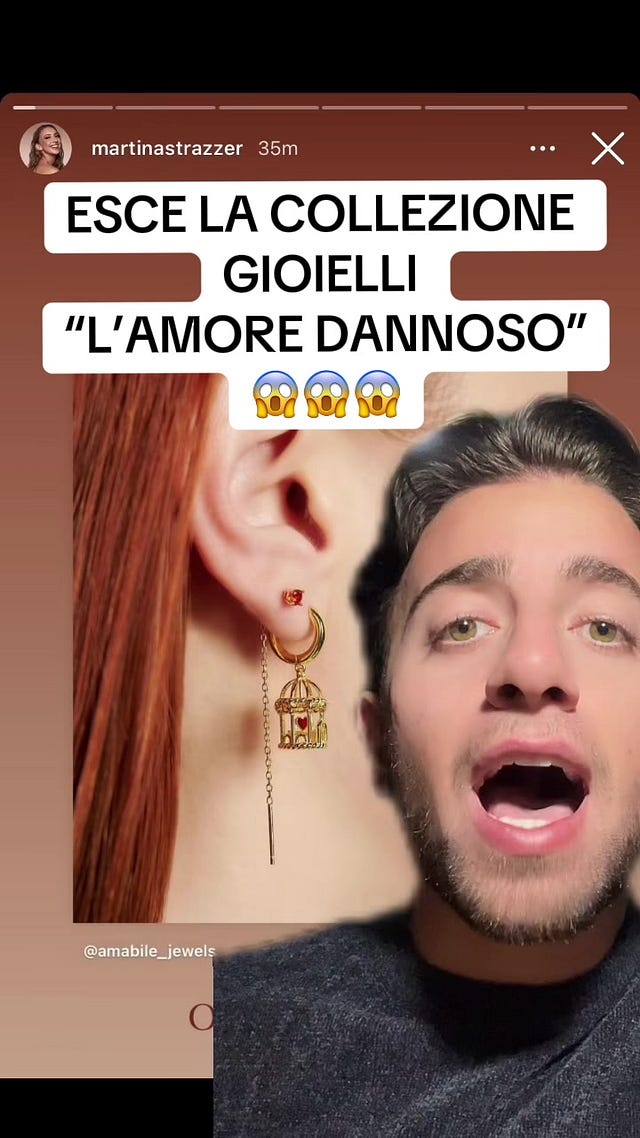 Strazzer nei suoi video parla senza remore di fluidi corporei, attacchi di dissenteria, meteorismo, allergie, ciclo mestruale, ovviamente per combattere “lo stigma” che circonda questo tema. Racconta che soffre di neuropatia del pudendo (o vulvodinia, una malattia “internet based” come spiegavo qui) e quando si lascia con un fidanzato fa intendere che il motivo sarebbe proprio quello, sollevando un’ondata di indignazione della sua community contro il suo ex. Questo soprattutto rafforza il legame con la community che vede in Martina Strazzer un’amica con i loro stessi problemi. A un certo punto, inventa anche il format “mi cambio le orecchie” (per esempio qui e qui), ossia video in cui mostra l’operazione di cambiarsi gli orecchini dai suoi innumerevoli buchi e piercing (esemplare momento dimostrativo di esposizione della merce che passa direttamente nella sua carne). Gli anni dal 2020 al 2025 di Martina Strazzer su TikTok sono comunque costellati di flame, drama e shitstorm. Li possiamo ripercorrere grazie alla Biblioteca di Alessandria della gen Z, cioè Webboh; ma la più rilevante è quella legata a un gioiello (un orecchio con un cuore in gabbia) che fa parte della collezione “Amore Dannoso”, dedicata appunto all’amore tossico “che alcune donne vivono e dentro cui rimangono prigioniere, vittime di uomini che prendono potere su ogni aspetto della loro vita”, cosa che Martina Strazzer dice di aver sperimentato sulla propria pelle. Ma nello stesso momento online impazza con furia l’indignazione e lo shock per la morte di Giulia Cecchettin e le community accusano Strazzer di “aver strumentalizzato quel particolare tema”. La sua strategia, quando coinvolta in una shitstorm, è sicuramente quella giusta: sottrarsi al momento d’indignazione per poi tornare quando il pubblico si è calmato (e ha rimosso l’accaduto), presentandosi con un colpo di scena che le permette di riappropriarsi dello storytelling.